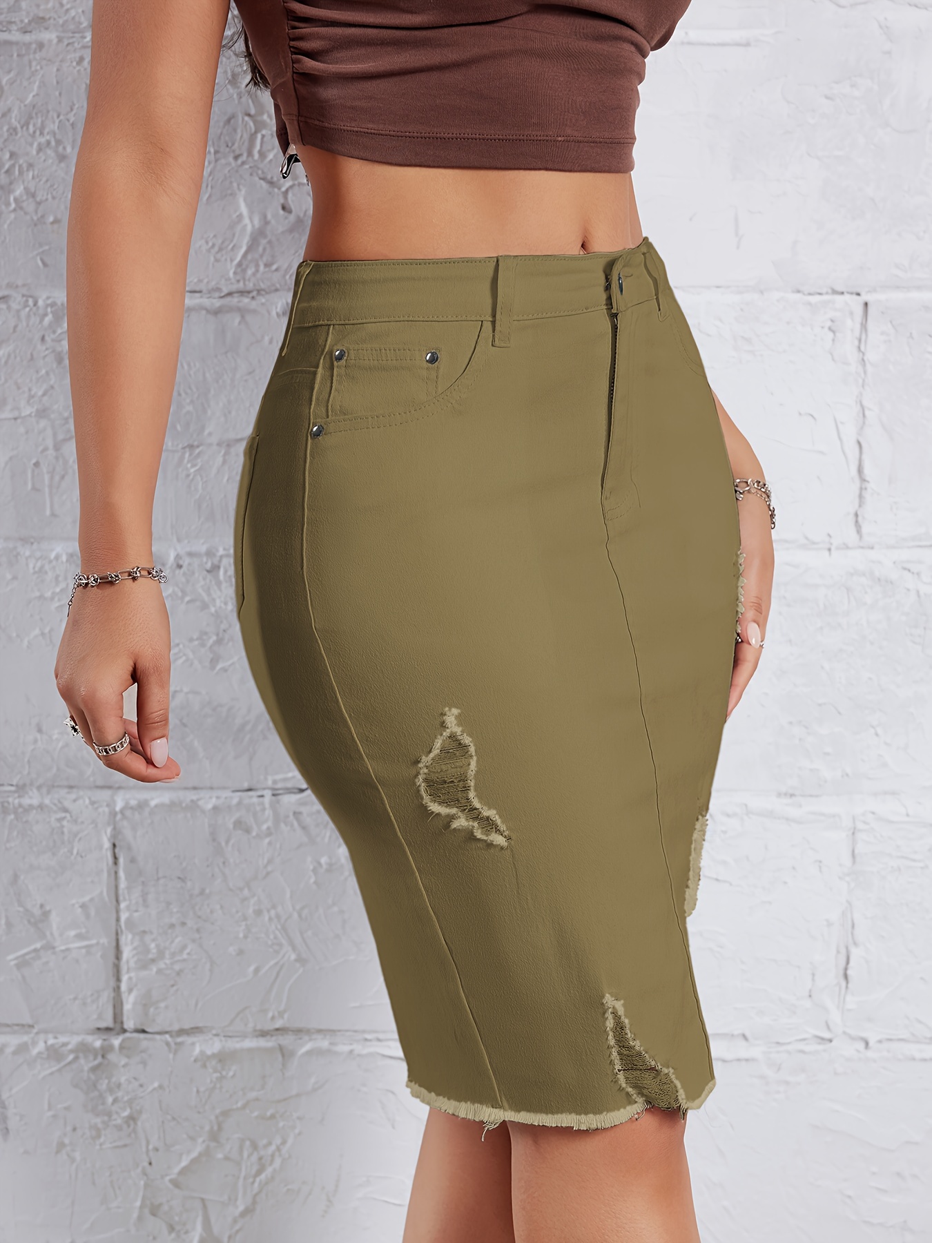 Hot Ripped High Waisted Bodycon Midi Denim Skirt, Women's Denim Jeans & Clothing