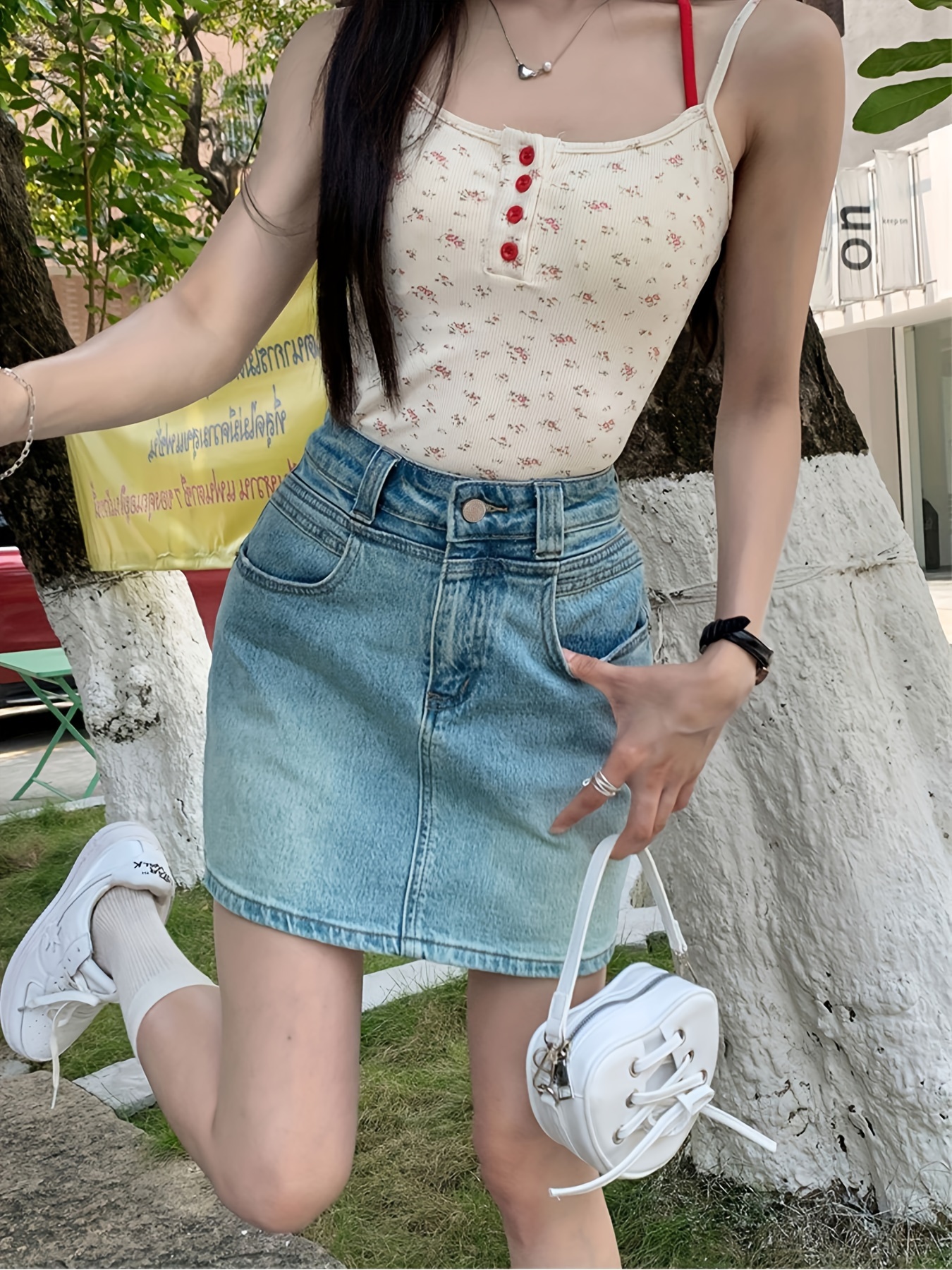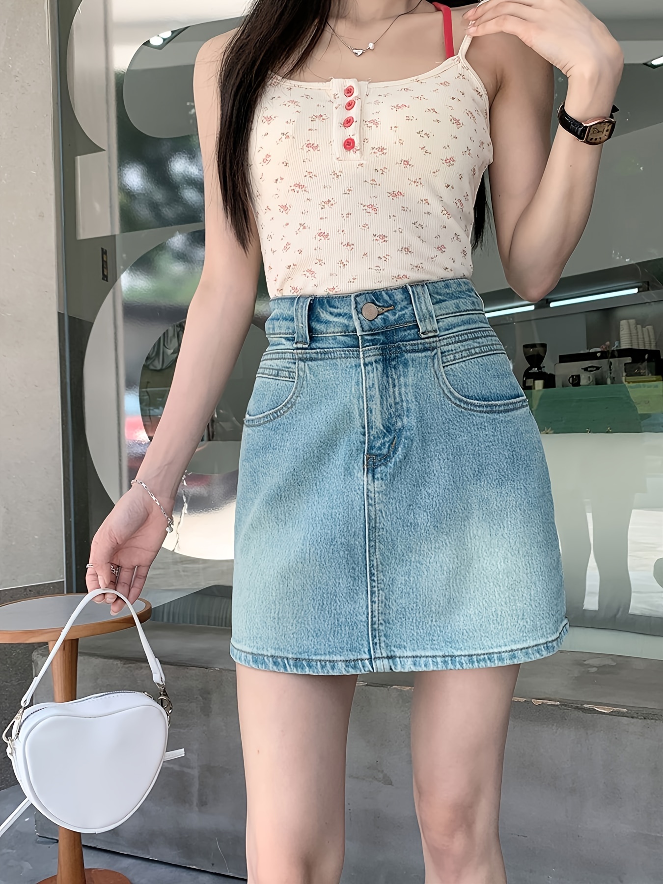 Plain Washed Blue High Rise Basic Style Mini Denim Skirt, Women's Denim Jeans & Clothing