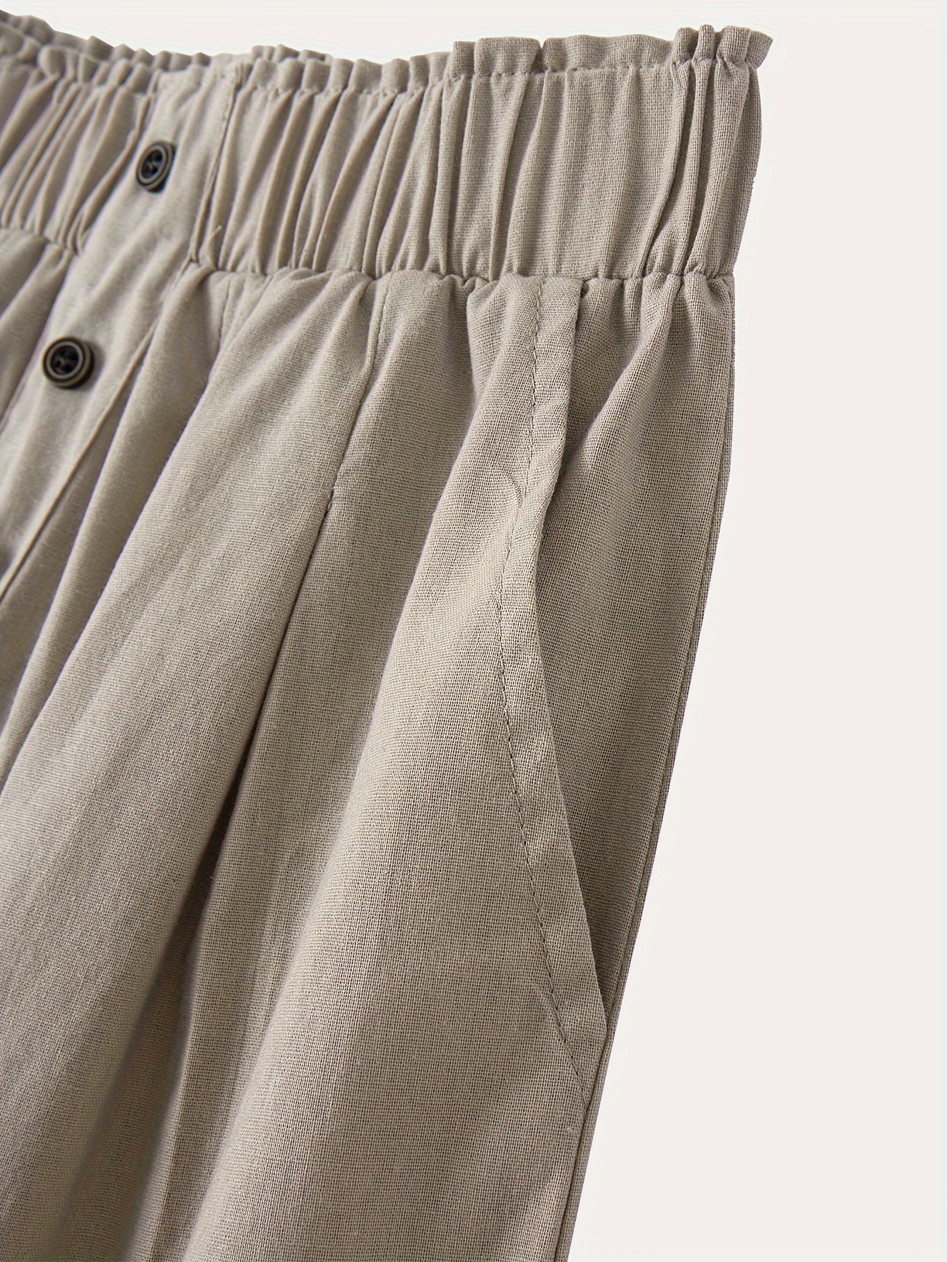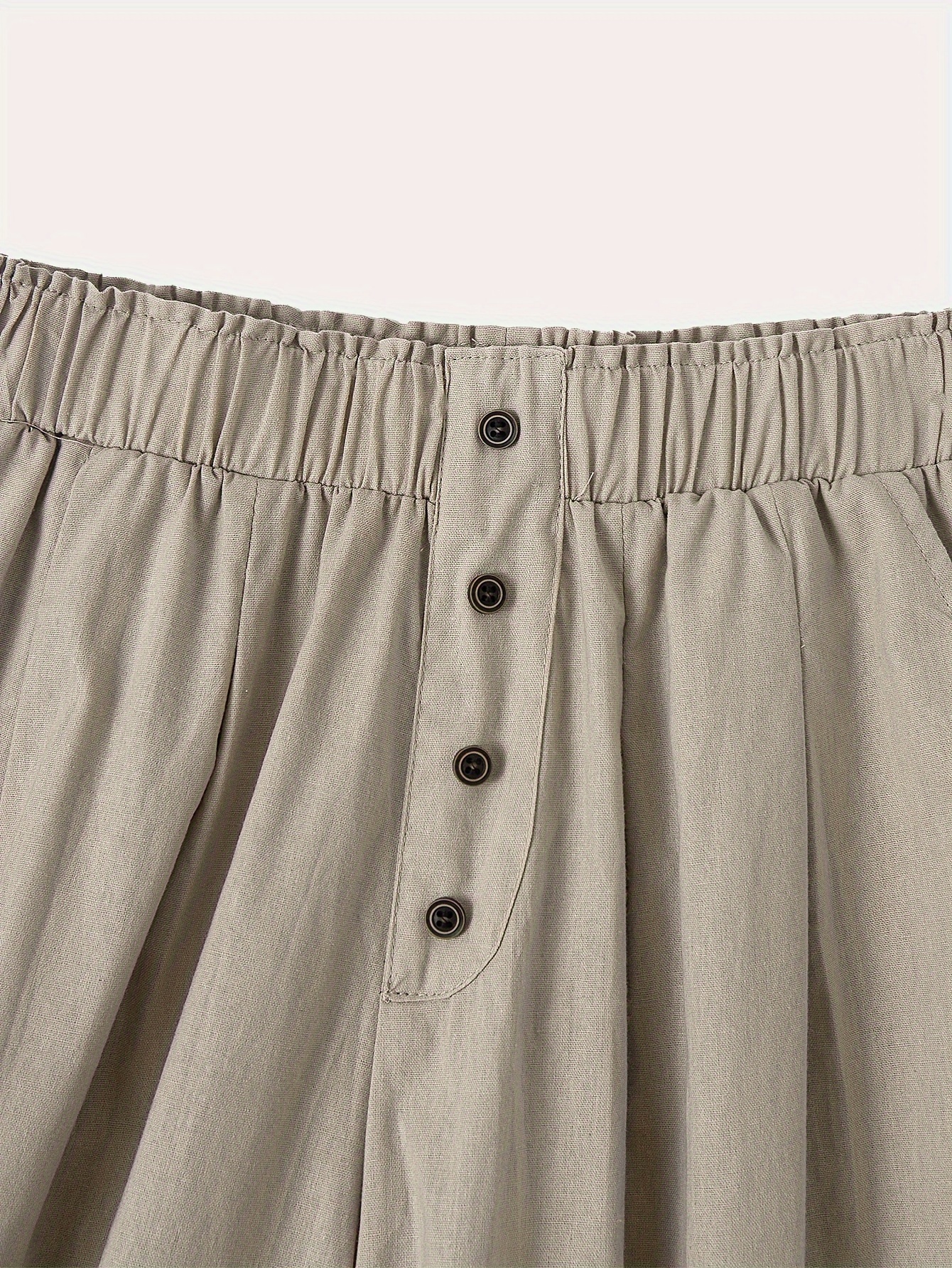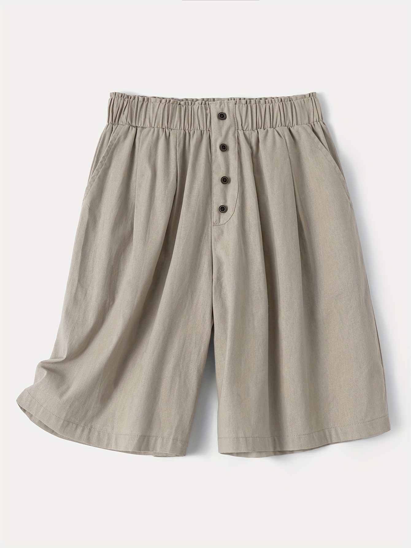Women's Casual Cotton Shorts with Elastic Waistband and Decorative Buttons - Loose Fit, Solid Color, Machine Washable