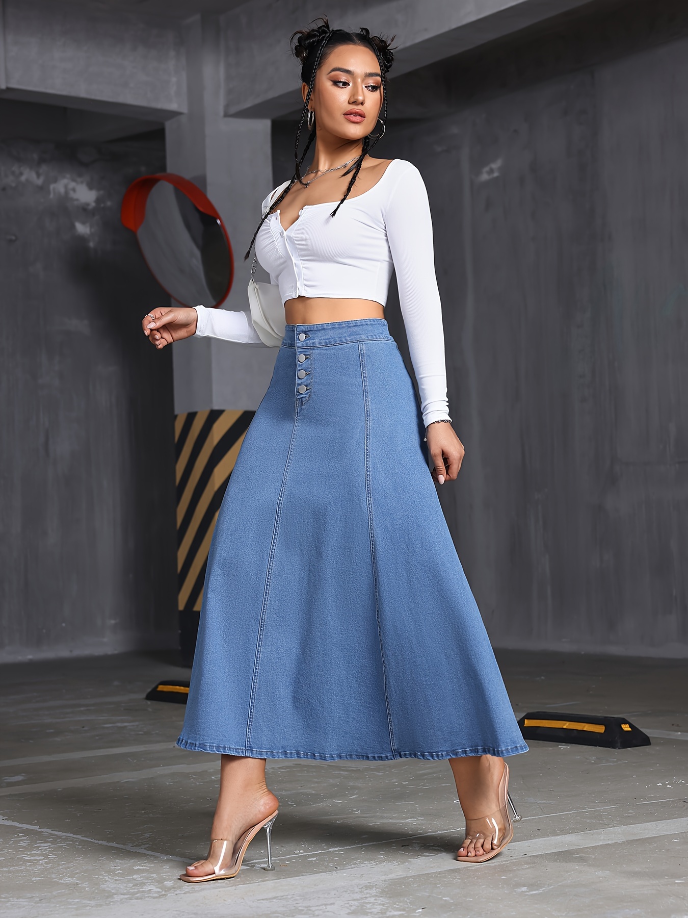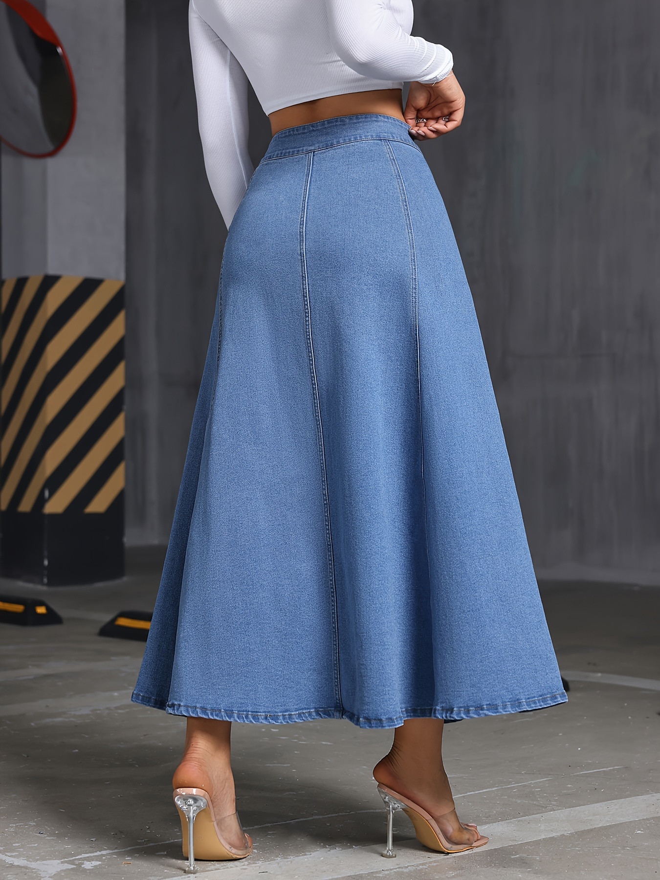 Comfy Stretchy Maxi Denim Skirt - Soft Washed Blue, Single-Breasted, Flattering Fit, Women's Denim Jeans & Clothing, Perfect for Casual Daily Wear, Versatile and Chic